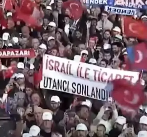Sakarya’da Cumhurbaşkanı Erdoğan’ın mitinginde açılan “İsrail ile ticaret utancı sonlandırılsın” pankartı apar topar kaldırıldı.